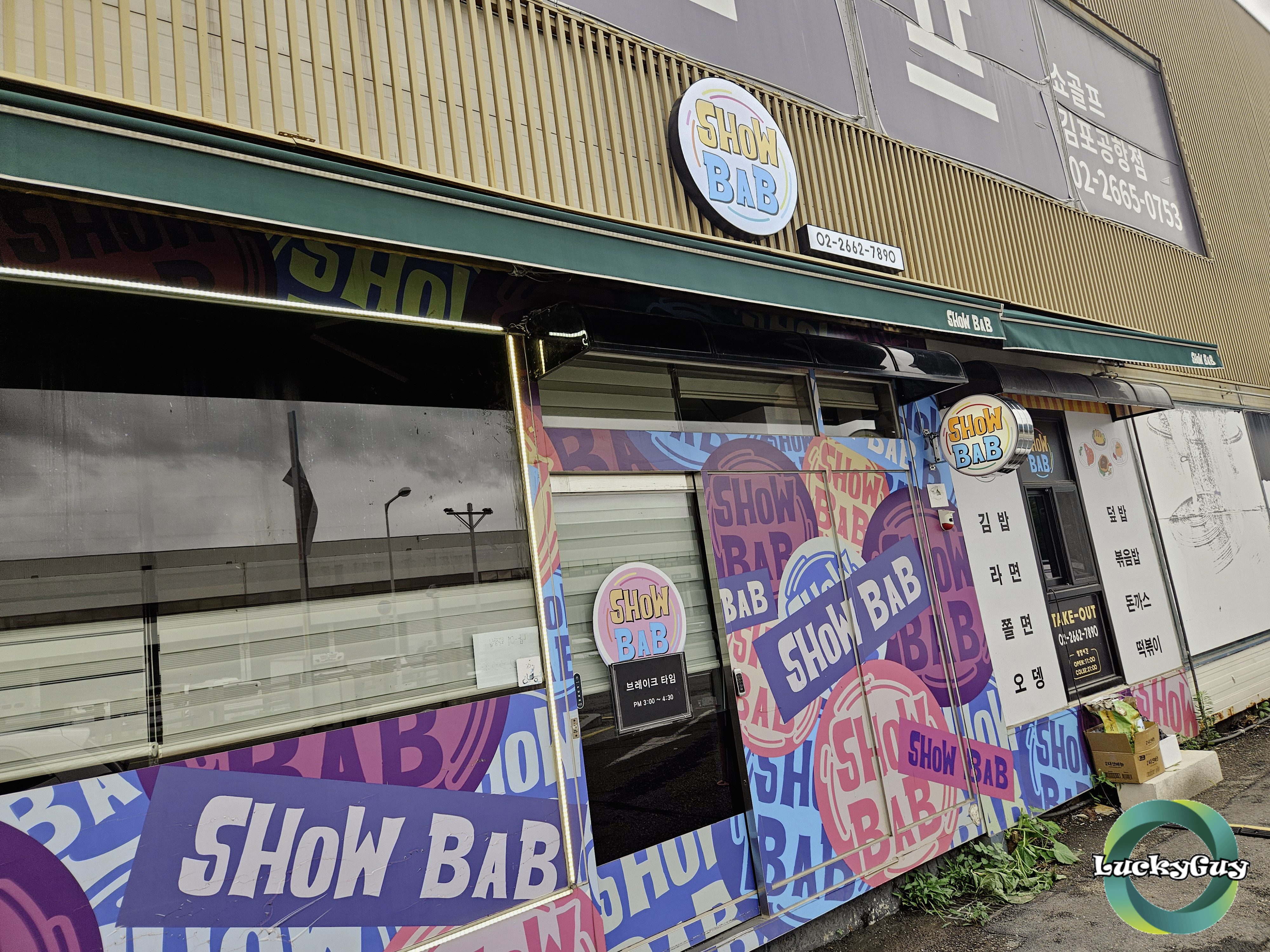 운동했으면 먹어야죠! 바로 옆 **SHOW BAB(쇼밥)**이라는 테이크아웃 전문 김밥집이 있어요. 라면, 김밥, 오뎅, 떡볶이 같은 ‘국민간식’부터, 든든한 돈까스, 제육, 볶음밥까지 다양하게 준비돼 있어요.