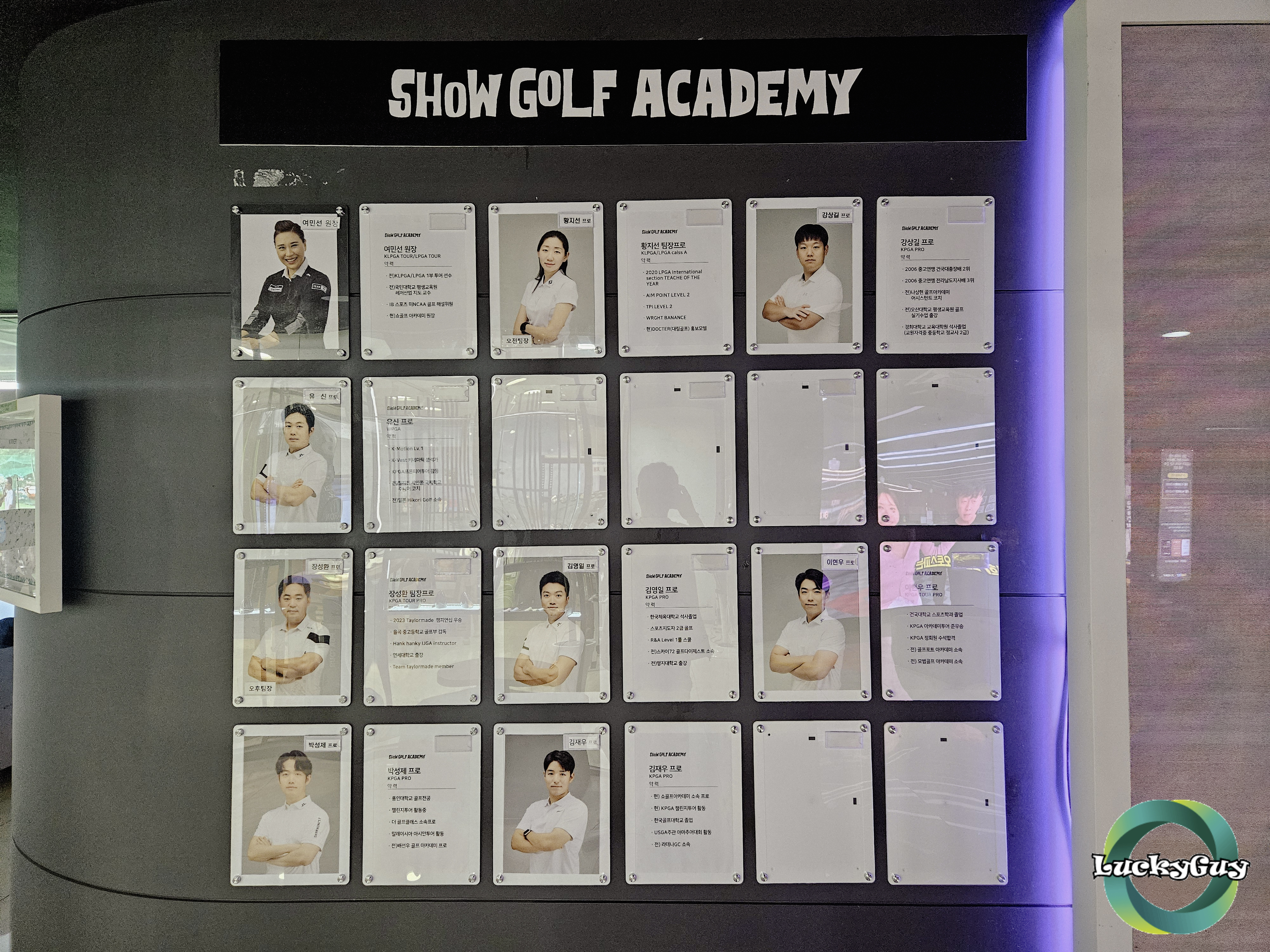 Show GOLF ACADEMY의 다양한 프로님들도 상주 중! 입구 쪽 벽면에는 프로 소개가 정리되어 있어, 본인 스타일 맞는 레슨도 골라서 받을 수 있어요. 프로 한 분 한 분 경력도 탄탄해서 믿음이 갑니다.