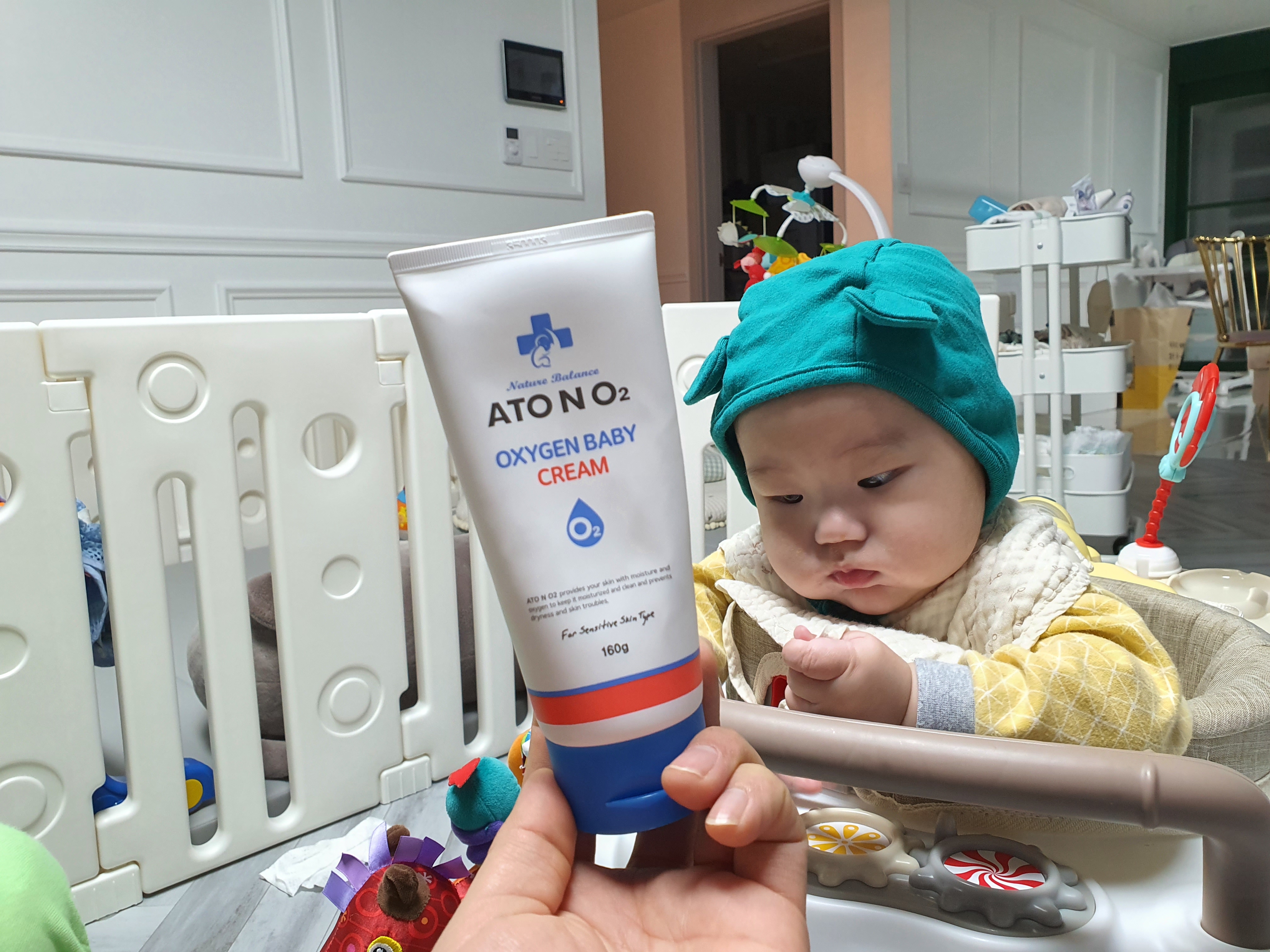 럭키가이 늦둥이 아들 아내님이 선택한 아토앤오투 옥시젠 베이비 크림 아침 저녁으로 신나게 발라줍니다.