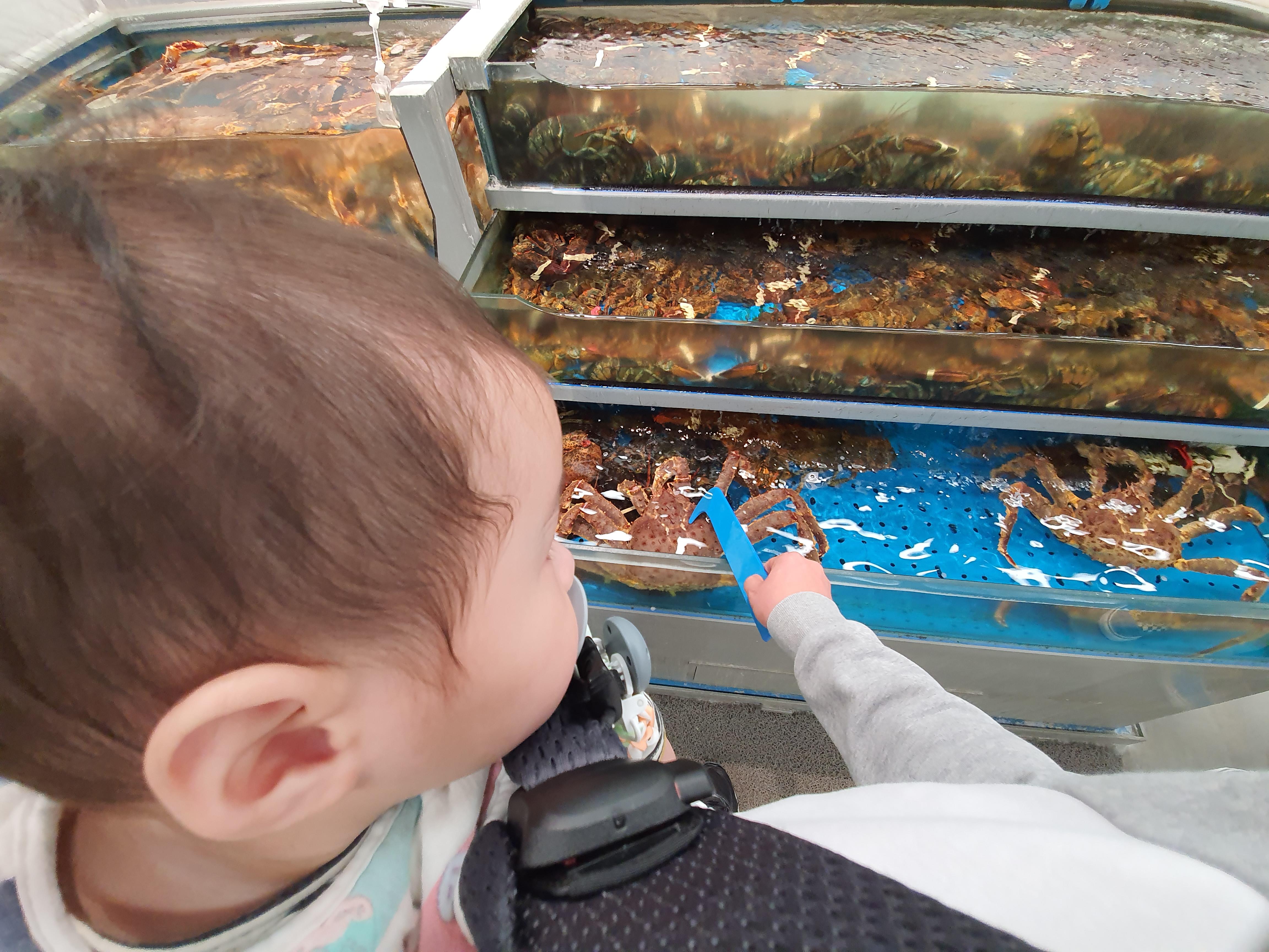 쥐띠아들 엄마, 누나는 장보러가고 늦둥이 아들에게 킹크랩, 랍스터 구경 시켜줍니다. 이빨나고 먹을수 있을때 아빠랑 신나게 사먹자